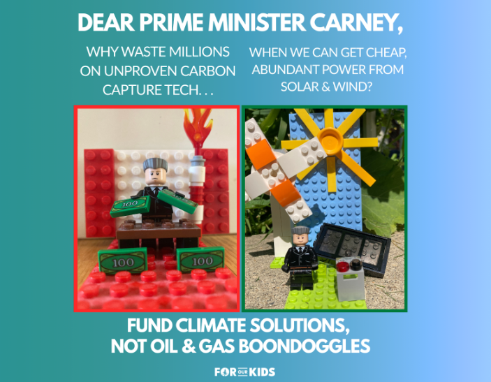 When For Our Kids Alberta team leader Claire Kraatz mentioned she’d be speaking against taxpayer-funded carbon capture projects at the August 20th “No More Public Dollars For Pipelines” rally in Calgary, Theo and I got to work again. This time, instead of featuring Danielle Smith, we wanted to show Mark Carney. As we dug through Theo’s minifigure bin, I started to worry that he didn’t have any gray-haired figures. Theo solved that problem by snapping off the top of a robot, and we made yet another climate meme.