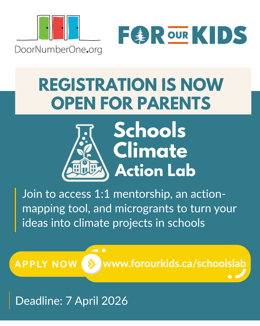 For Our Kids and Door Number One invite you to join the Schools Climate Action Lab. This is designed for parents and caregivers across Canada, as a place to connect, strategize, and turn climate goals, like cleaner air and electric school buses, into reality for your schools.